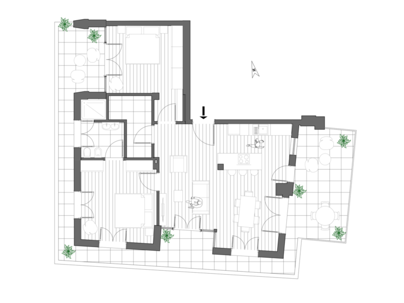 Helle, großzügige Räume und zwei sehr große Schlafzimmer – eines mit Bad mit Fenster, das andere mit WC – prägen diese Wohnung im 5. Obergeschoss. Balkone auf drei Seiten, zwei Loggias sowie eine Terrasse erweitern den Wohnraum nach außen und schaffen lichtdurchflutete Wohnbereiche mit Ausrichtung nach Süden, Osten und Westen.