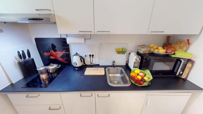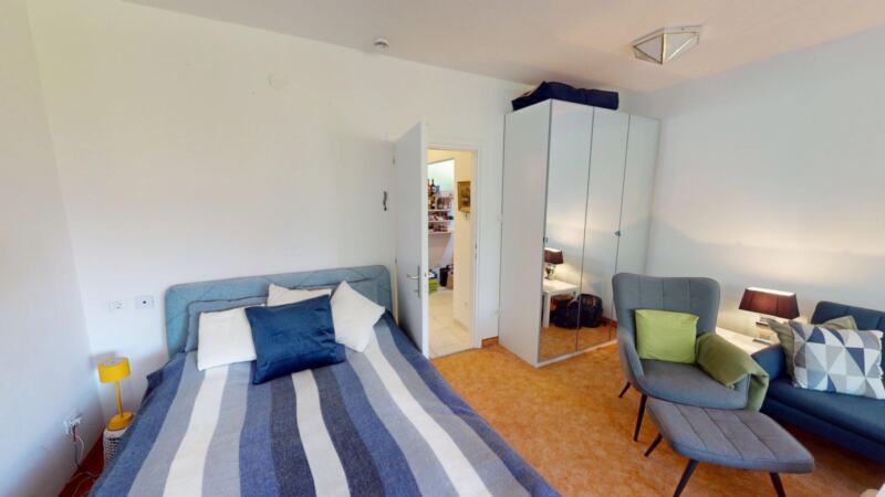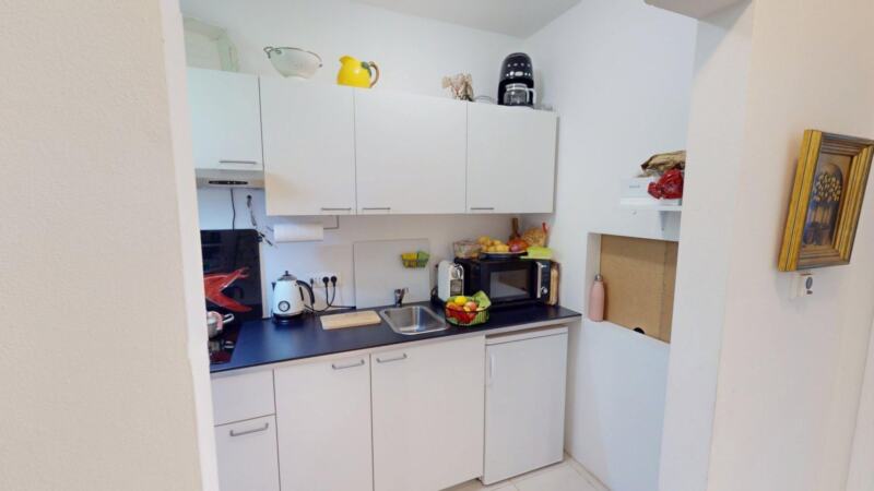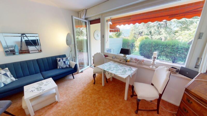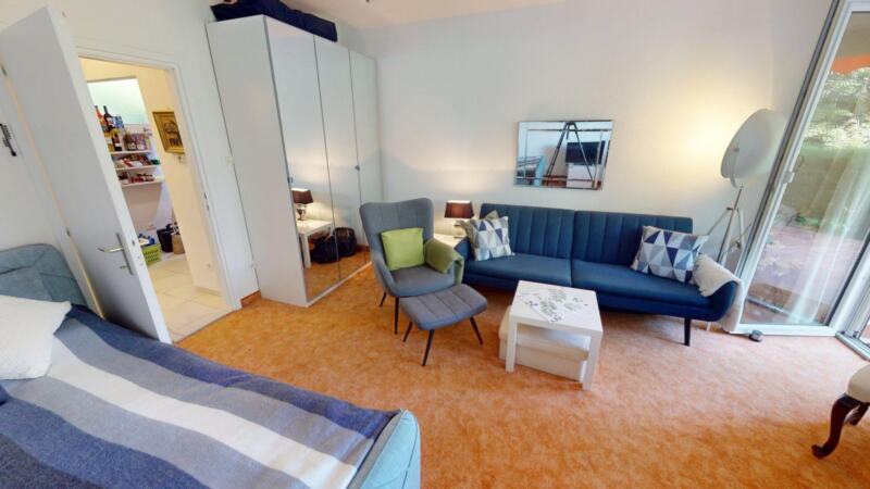Die Wohnung besteht aus einem großzügigen Zimmer mit direktem Zugang zur sonnigen Süd-West-Terrasse, einer separaten Küche sowie einem Badezimmer mit Dusche und Fenster. Von der Terrasse aus gelangt man unmittelbar in den gepflegten, gemeinschaftlichen Gartenbereich, der über einen schönen Außenpool verfügt und allen Bewohnern des Kondominiums zur Verfügung steht.