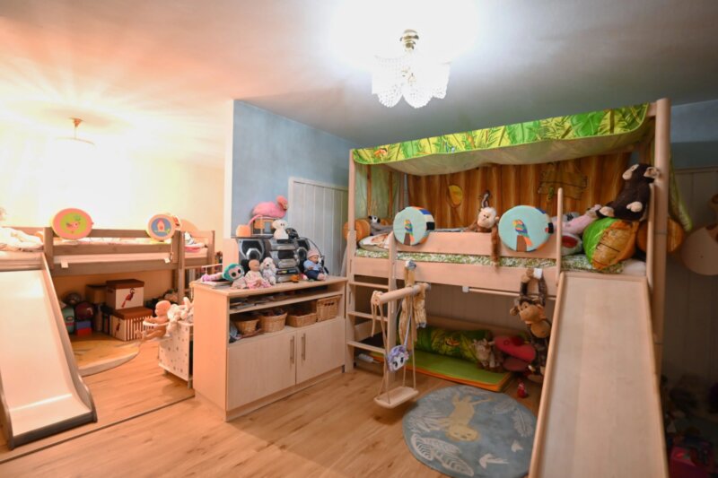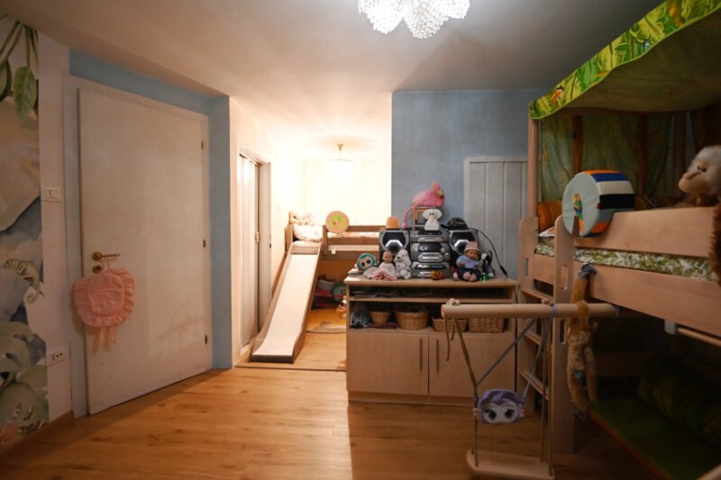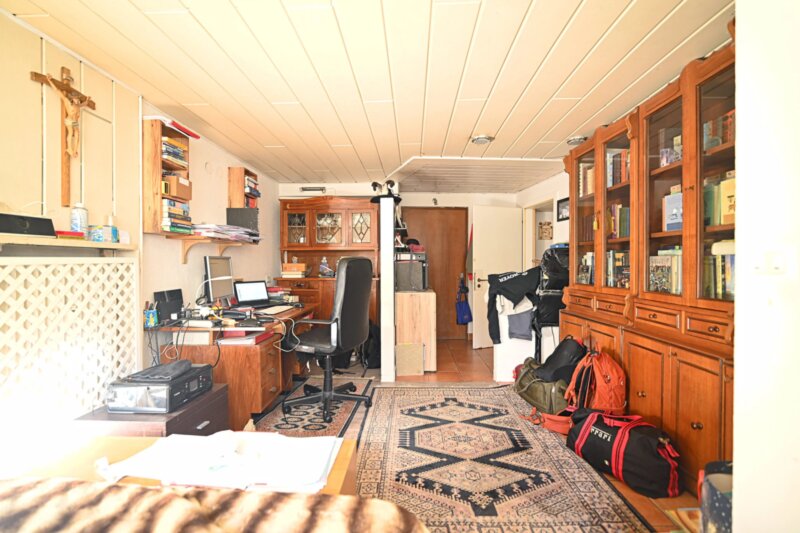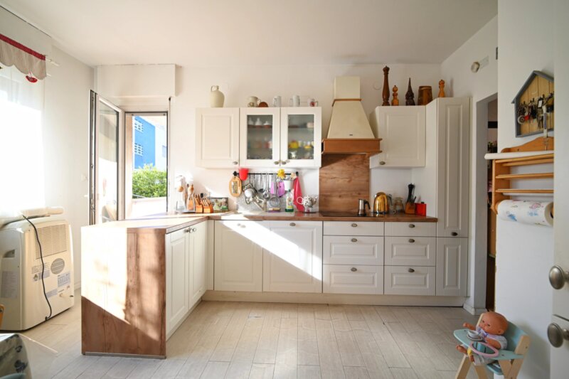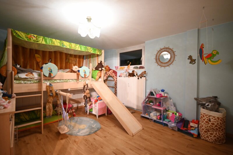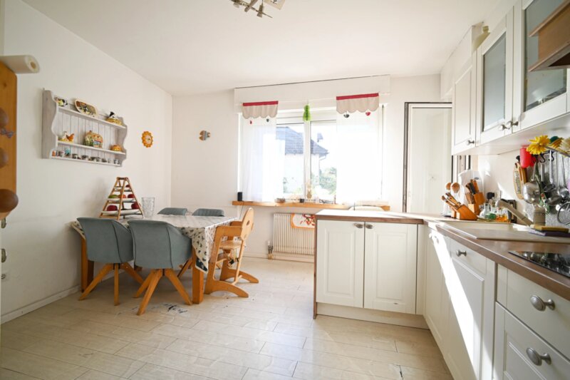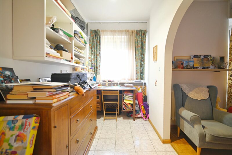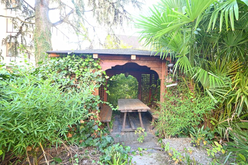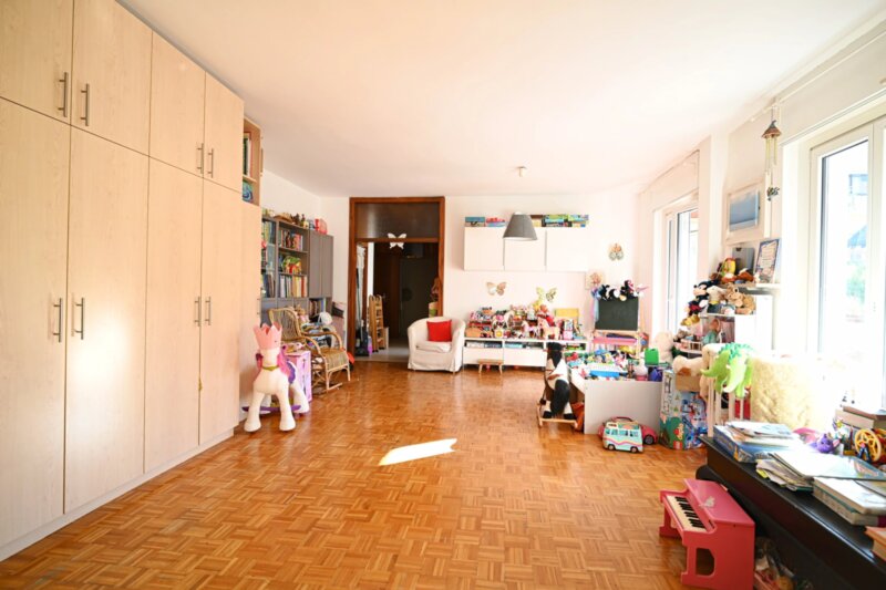Die Wohnung wurde in den 1990er Jahren vollständig saniert und bietet großzügige Räume, die sich angenehm und funktional verteilen. Von einen der drei Eingangsbereiche gelangt man in das helle Wohnzimmer, das durch mehrere Türen und den Zugang zu einem der drei Balkone ein luftiges Raumgefühl vermittelt. Durch die drei autonomen Eingänge wäre die Wohnung auch in drei Einheiten teilbar. Die angrenzende Küche ist gut proportioniert und eignet sich sowohl für den Alltag als auch für gesellige Abende. Vier Schlafzimmer bieten vielseitige Nutzungsmöglichkeiten, etwa als Schlafräume, Homeoffice oder Hobbybereich. Zwei Badezimmer, ein zusätzliches WC sowie insgesamt drei Balkone sorgen für hohen Wohnkomfort. Besonders hervorzuheben ist der 388,2 m² große Garten, der viel Platz für Entspannung, Spielbereiche oder individuelle Gestaltungsideen bietet.