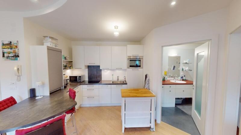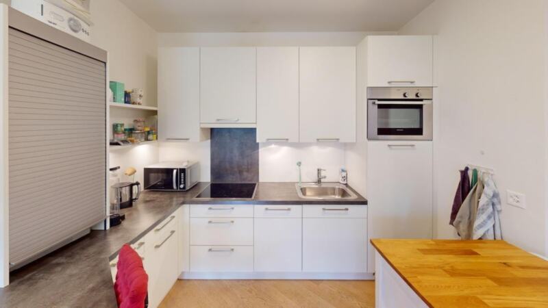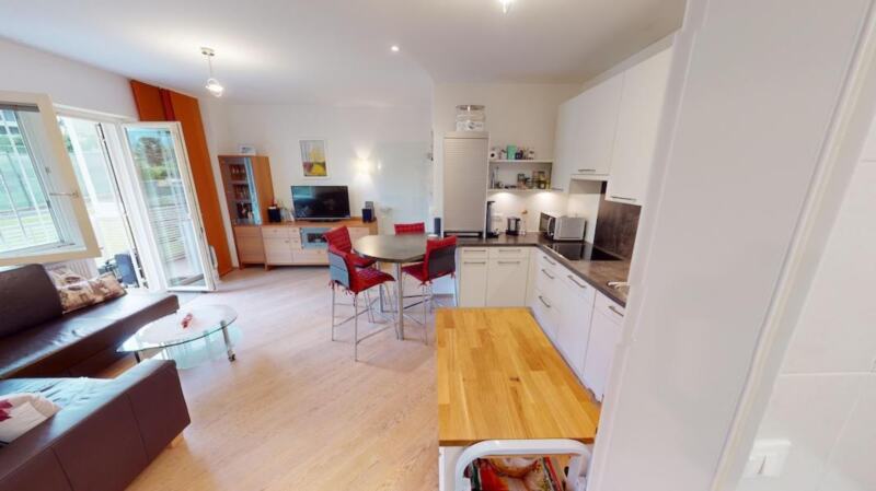 Die Wohnung verfügt über einen offenen Wohnbereich mit integrierter Küche, ein Badezimmer mit Dusche und ein gemütliches Schlafzimmer. Sowohl vom Wohnbereich als auch vom Schlafzimmer aus gelangt man auf die Terrasse und in den gemeinschaftlichen Garten. Dieser Bereich bietet exklusive Nutzungsmöglichkeiten, da sich in diesem Eck des Gartens nur diese Wohnung befindet. Ideal, um sich auf Liegestühlen zu entspannen und die Ruhe zu genießen.