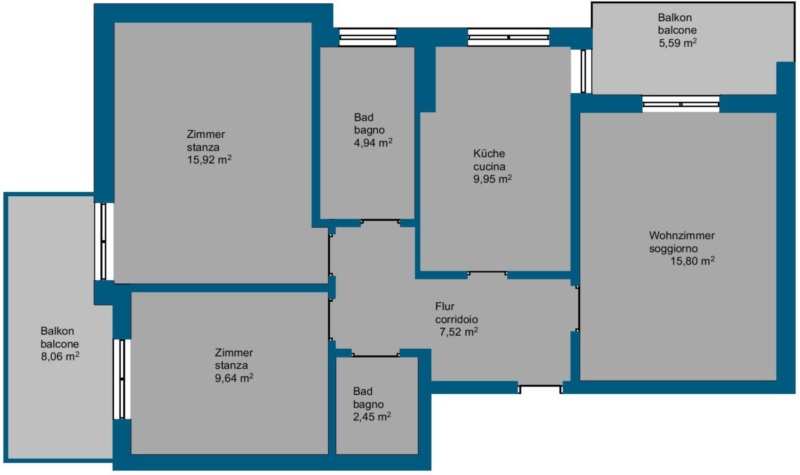 Die Wohnung wurde vor komplett saniert und verfügt über zwei Schlafzimmer, zwei Bäder, einer separaten Küche, zwei Balkone sowie einem gemütlichen Wohnraum. Vor Kurzem wurde sogar die autonome Gasheizung erneuert.
