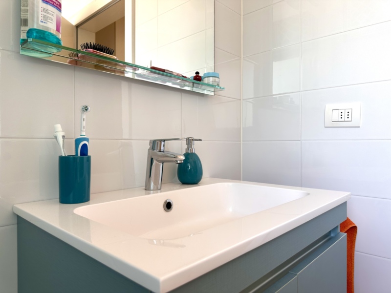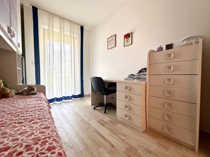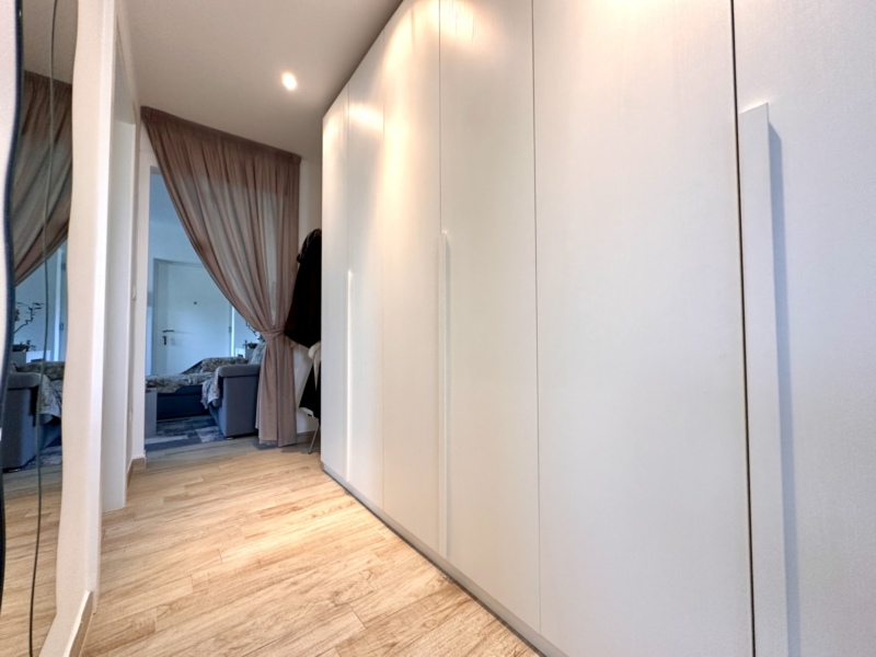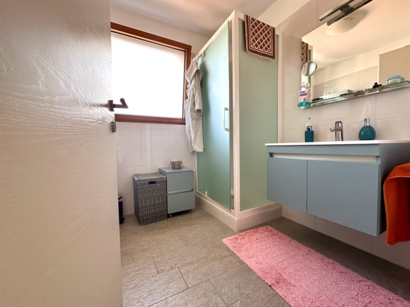 Der Schlafbereich ist durchdacht und funktional gestaltet, mit einem geräumigen Einbauschrank entlang des Flurs und zwei Schlafzimmern. Das Einzelzimmer bietet direkten Zugang zur wunderschönen Terrasse, während das Hauptschlafzimmer mit knapp 13 Qm Nettowohnfläche durch ein großes Fenster mit viel Tageslicht überzeugt. Das Badezimmer ist mit Dusche ausgestattet, verfügt über einen Wschmachinenanschluss und ist dank Fenster hell und gut belüftet.