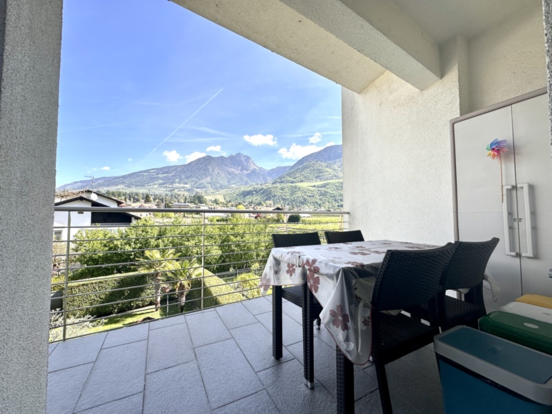 Das Herzstück der Wohnung ist die großzügige, tiefe Terrasse - ein privilegierter Rückzugsort, an dem der Tag mit einem entspannten Früstück im Freien beginnen und mie einem Glas Rotwein ausklingen kann, während der Blick u4ber das satte Grün der Berge von Tirol, Schenna und Meran 2000 schweift.