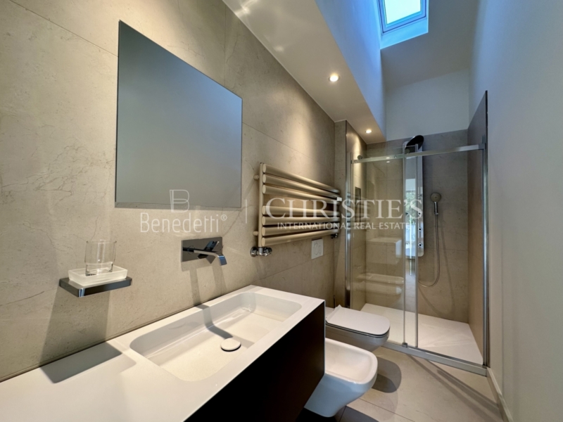 Eine neue Glastreppe führt Sie in das obere Geschoss sowie letztem Stockwerk, wo ein heller Vorraum den Weg zu einem weiteren, flexibel nutzbaren Raum weist, der sich ideal als Schlafzimmer oder gemütliches Wohnzimmer eignet. Von hier aus gelangen Sie auf einen kleineren Balkon mit Nord-West-Ausrichtung sowie auf die großzügige Sonnenterrasse mit herrlichem Süd-/Ostblick – ein Highlight für alle, die das Leben im Freien lieben. Ein weiteres modernes Badezimmer mit Dachfenster sorgt für zusätzlichen Komfort.