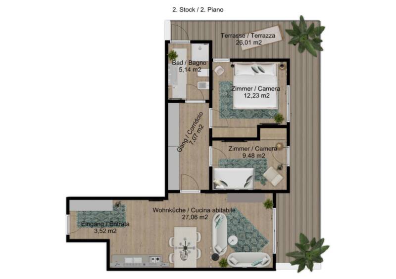 Diese neu gebaute 3-Zimmer-Attikawohnung im zweiten Stock eines Wohnkomplexes in Montan zeichnet sich durch ihre funktionale Raumaufteilung und hochwertige Bauweise aus. Der Eingang führt in den hellen Wohnbereich mit Kochnische, der eine gemütliche und funktionale Atmosphäre schafft. Von hier aus gelangt man direkt auf eine Terrasse, die sich perfekt für entspannte Momente im Freien eignet. Die Wohnung verfügt über ein Hauptschlafzimmer und ein zweites Zimmer, beide mit direktem Zugang zu den Außenbereichen. Ein modernes Badezimmer mit Dusche sorgt für maximalen Komfort und Funktionalität. Darüber hinaus bietet die Wohnung einen Dachboden, der sich ideal als zusätzlicher Stauraum oder für andere Bedürfnisse eignet.