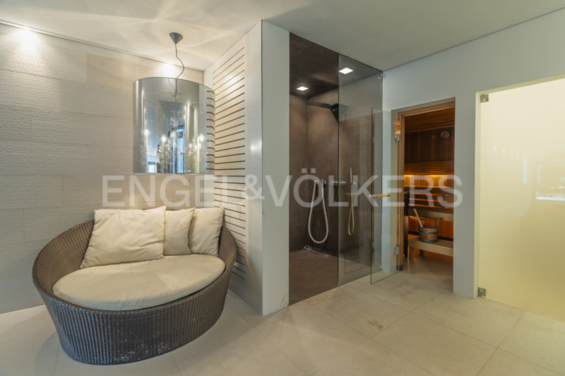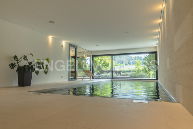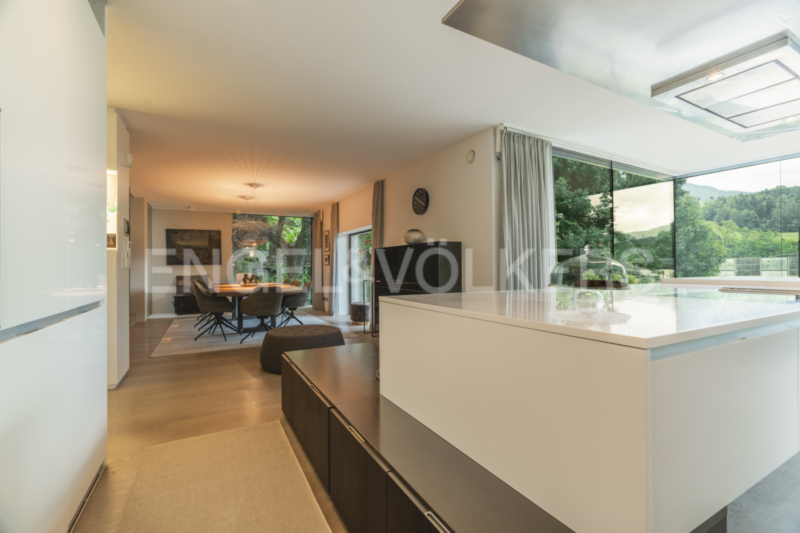 Entworfen vom renommierten Architekturbüro „bergmeisterwolf“, vereint diese exklusive Villa luxuriöses Design mit einzigartigem Lebensgefühl. Harmonisch eingebettet in die Landschaft fügt sich das markante Gebäude wie von Zauberhand in die Natur ein. Großzügige, raumhohe Glasfronten fluten die Wohnbereiche mit natürlichem Licht und schaffen einen Ausblick ins Grüne, wodurch die Natur zum festen Bestandteil des Wohngefühls wird. Ein elektrisches Tor führt auf das Anwesen und den stilvoll angelegten Garten. Neben mehreren Stellplätzen im Einfahrtsbereich verfügt die Villa über eine Tiefgarage mit bis zu 5 weiteren Stellplätzen. Der Zugang zum Gebäude ist bequem über die Tiefgarage und über den Haupteingang im Erdgeschoss möglich. Die Nutzfläche erstreckt sich über insgesamt 4 Etagen, welche alle mit einem modernen Aufzug verbunden sind. Der Polytherm Pool im Erdgeschoss zählt zu den Highlights dieser Villa. Die Sauna der Marke „Klafs“ und die Dusche komplettieren die private Wellnessoase. Das Erdgeschoss beherbergt zudem ein komfortables Gästezimmer mit Bad sowie einen praktischen Waschraum. Die Bäder wurden vollständig mit Elementen von Agape gestaltet - von Wasserhahn bis hin zur freistehenden Badewanne. Das mit schlichter Eleganz gestaltete Treppenhaus führt in das Herzstück der Villa: Im offen gehaltenen ersten Obergeschoss gehen Koch-, Ess- und Wohnbereich fließend ineinander über. Die elegante Boffi-Küche ist ausgestattet mit zwei Backöfen, einem Teppanyaki-Grill sowie einem Induktionskochfeld von Gaggenau. Die Villa überzeugt zusätzlich durch maßgefertigte Tischlerarbeiten von Barth und Erlacher. Im Masterbereich sorgen maßgefertigte Poliform-Schränke für großzügigen Stauraum, während auch der begehbare Kleiderschrank, die Bibliothek, das Kinderzimmer und das Esszimmer mit exklusiven Möbeln derselben Marke ausgestattet sind. Im Kellergeschoss befinden sich nicht nur die technischen Anlagen für das Hallenbad, sondern auch die Pellet-Heizung, sowie ein Weinkeller und mehrere zusätzliche Räume, die flexibel genutzt werden können. Modernste Technik rundet das Wohnkonzept ab: Eine vollautomatisierte Lüftungsanlage, elektrisch programmierbare Rollläden, eine Alarmanlage, eine zentrale Staubsaugeranlage sowie die Photovoltaikanlage auf dem Dach sorgen für höchsten Wohnkomfort.