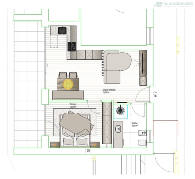 Diese moderne, nicht konventionierte Zweizimmerwohnung befindet sich im letzten Stock des West-Hauses. Die Wohnung besteht aus einem Eingangsbereich, einem hellen Wohnraum/Küche mit Ausgang zur Westterrasse, einem Schlafzimmer und einem Bad mit Fenster.