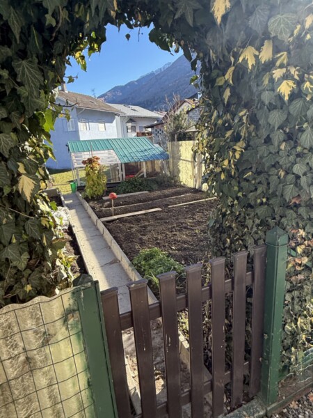 Zur Wohnung gehören außerdem eine Garage, ein Kellerraum sowie ein etwa 40 m² großer Gemüsegarten, der zusätzlichen Freiraum im Grünen bietet.