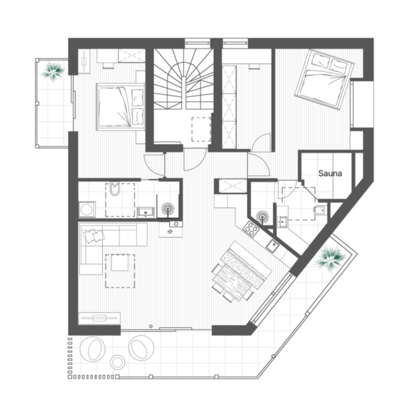 Die Wohnung wurde mit viel Liebe zum Detail modern eingerichtet und bietet eine gemütliche Atmosphäre mit einem Holzofen, der für behagliche Wärme sorgt. Zwei Schlafzimmer, jeweils mit eigenem Badezimmer, bieten Komfort und Privatsphäre; eines davon ist sogar mit einer eingebauten Sauna ausgestattet – der perfekte Rückzugsort für Entspannung und Erholung. Mit geringem Aufwand lässt sich problemlos ein drittes Schlafzimmer realisieren.