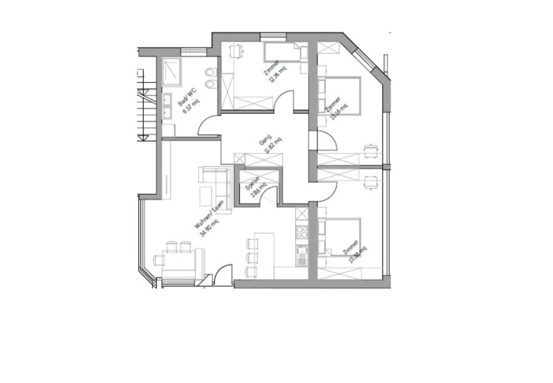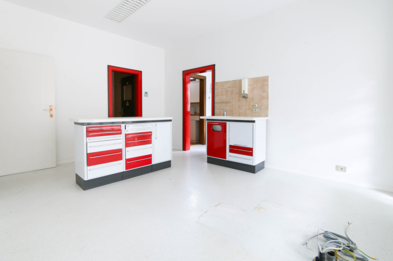 Daraus entsteht eine bestens geeignete Personal-Dienst-Wohnung, mit Gemeinschaftswohnküche im Eingangsbereich und drei großen Schlafzimmern mit Bad.