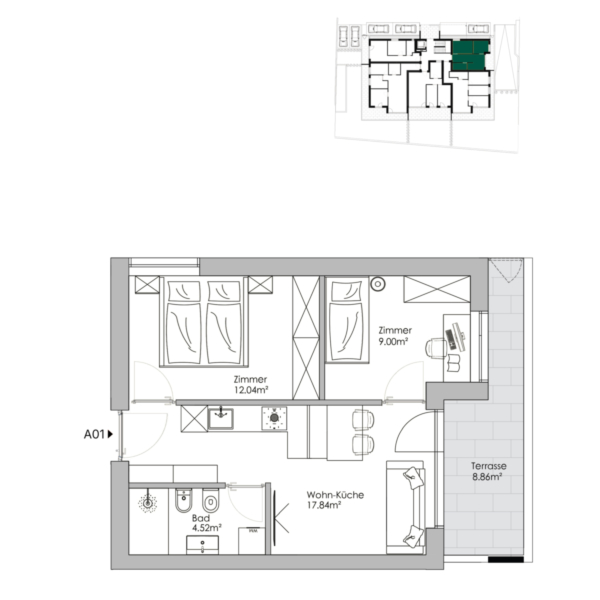 Konventionierte Dreizimmerwohnung im Erdgeschoss mit Wohnküche, zwei Schlafzimmern, einem Bad, einer Terrasse und einem Keller.