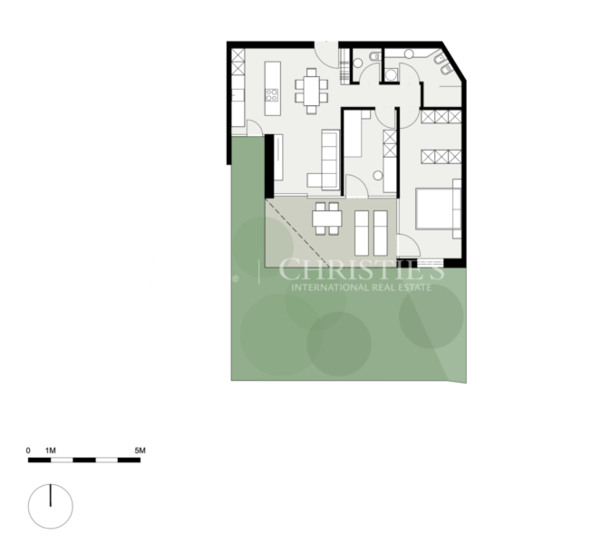 Der Wohnbereich mit Küchenzeile öffnet sich zur Loggia und zum Garten. Zwei Schlafzimmer bieten direkten Terrassen- und Gartenzugang. Ergänzt wird das Raumangebot durch ein Hauptbadezimmer, ein separates Tages-WC sowie ein Kellerraum.