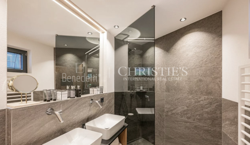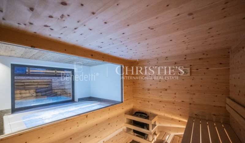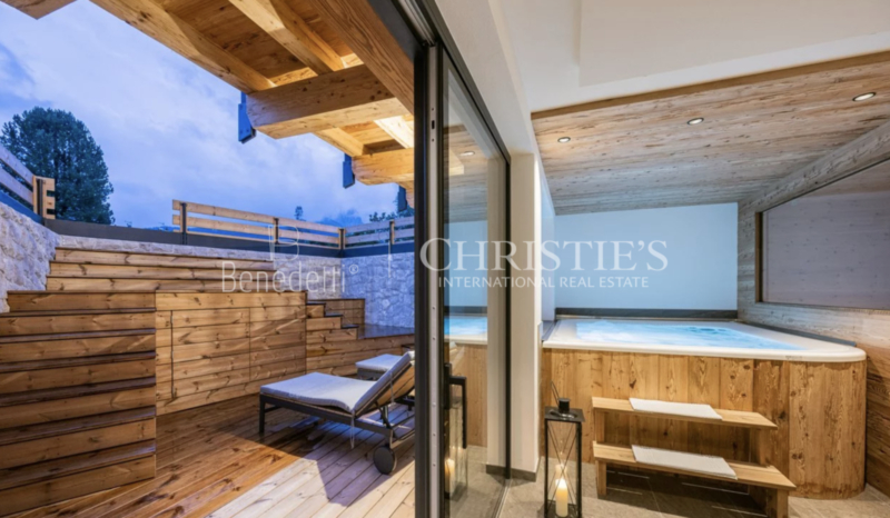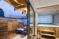 Im Erdgeschoss befindet sich ein stilvoller privater Wellnessbereich, ideal zum Entspannen nach einem Tag an der frischen Bergluft. Die Spa-Anlage verfügt über einen Whirlpool, eine Sauna sowie einen komfortablen Ruhebereich und wird durch ein separates Badezimmer ergänzt, das dem Wellnessbereich dient. Von dieser Ebene aus gelangt man zudem auf eine kleine Außenterrasse, die sich perfekt eignet, um die frische Luft der Dolomiten zu genießen und die Ruhe der alpinen Landschaft auf sich wirken zu lassen.