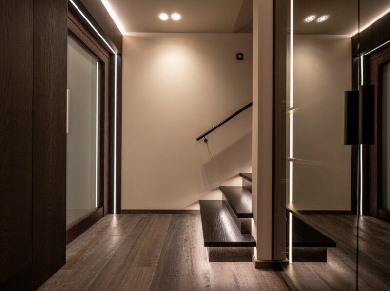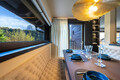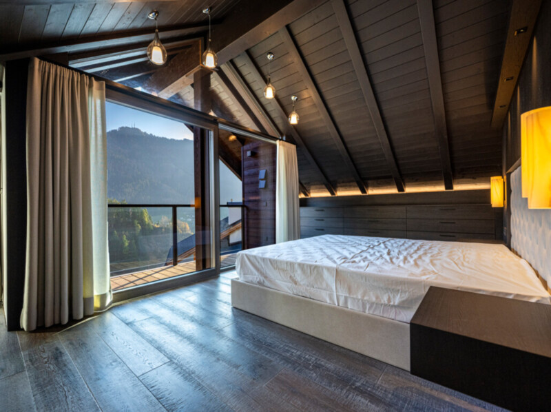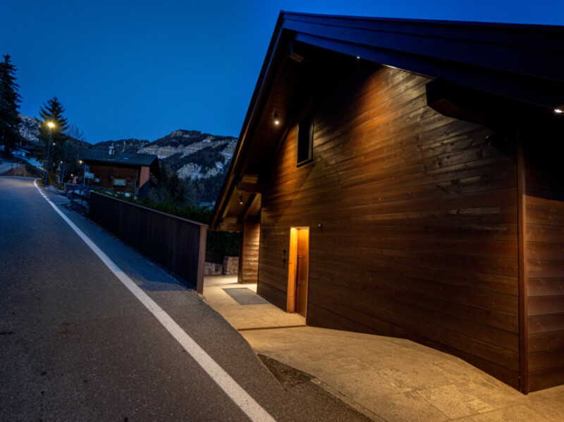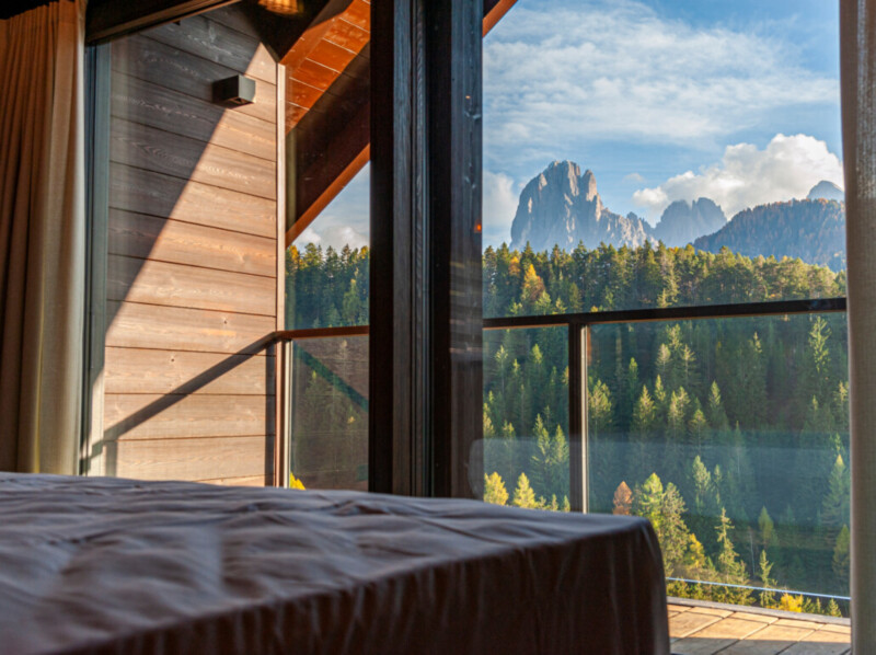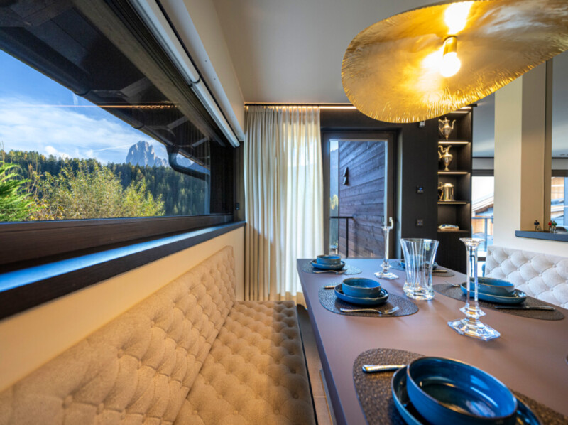 Durch die raumhohe und rahmenlose Verglasung geht der Wohnraum nahtlos in den Außenbereich über und lässt diesen mit der umliegenden Bergwelt der mächtigen Bergwelt verschmelzen.