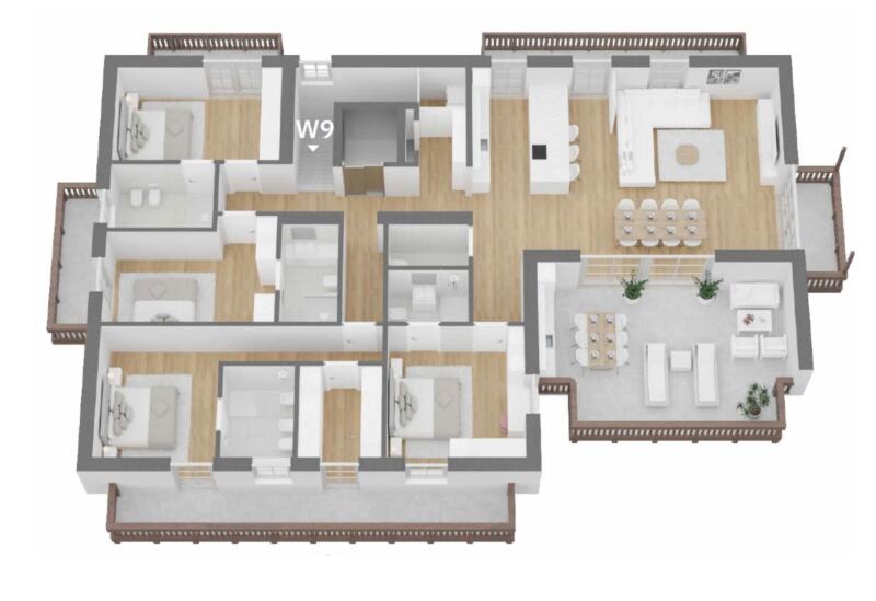 Die durchdacht gestaltete Wohnung besticht durch einen einladenden Eingangsbereich, eine offen gestaltete Wohnküche mit angrenzender Stube, drei Schlafzimmer – jeweils mit eigenem Badezimmer – sowie ein separates Tages-WC und einen praktischen Waschraum.