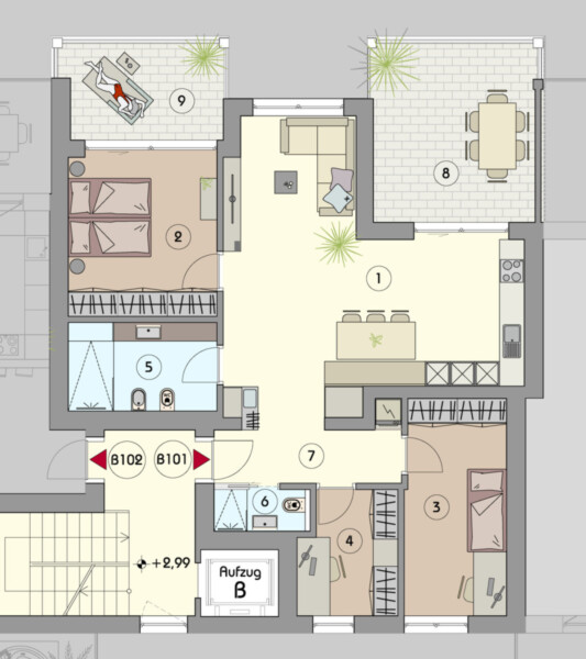 Questo trilocale al 1° piano offre circa 88 m² di superficie abitabile netta con luminosa cucina abitabile, due camere da letto, studio, WC di servizio e un bagno. Due terrazze esposte a ovest garantiscono ore di sole negli spazi esterni. È possibile acquistare separatamente una cantina, un box garage o un posto auto esterno.