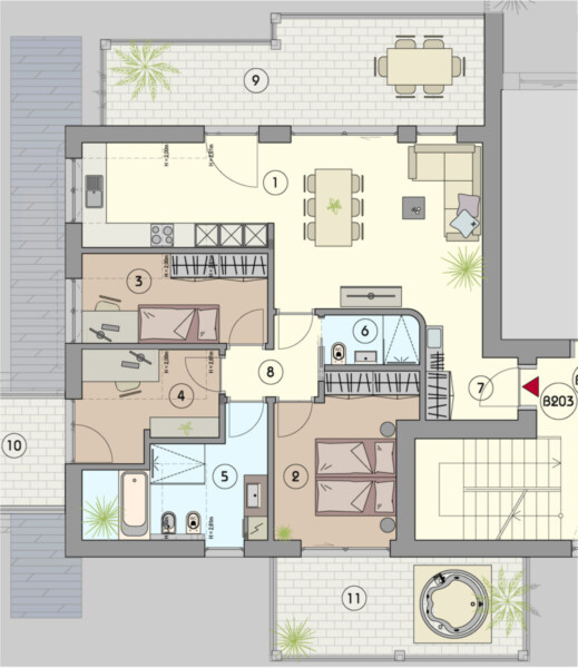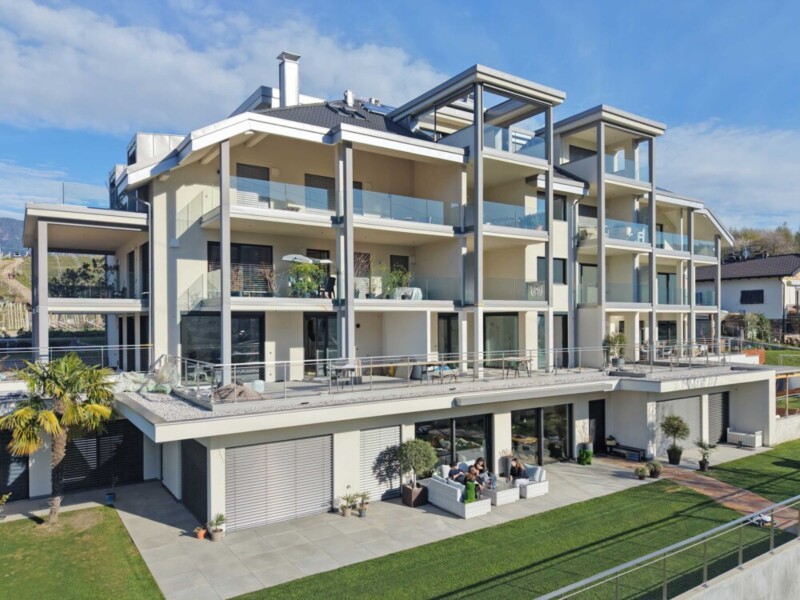 L'appartamento di quattro locali al 2° piano offre circa 82 m² di superficie abitabile netta con luminosa cucina abitabile, due camere da letto, studio, WC di servizio e un bagno con finestra. Tre terrazze esposte a sud, ovest ed est garantiscono spazi esterni soleggiati in ogni momento della giornata.