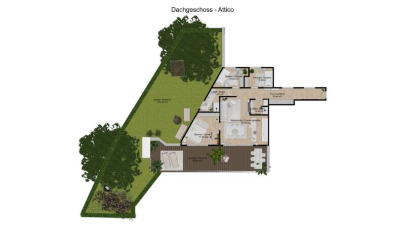 Questo esclusivo attico con 4 stanze unisce comfort abitativo moderno e ampi spazi esterni. L'appartamento è composto da una spaziosa camera matrimoniale e due luminose camere singole, utilizzabili in modo flessibile.