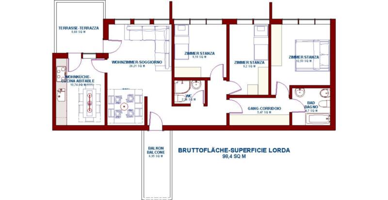 L’appartamento dispone di una superficie netta di 81 m², completata da un’ampia garage di 24,6 m² con altezza interna di 3,56 m – ideale per l’auto, le biciclette e lo spazio di deposito. Un ascensore spazioso vi accompagna comodamente fino alla porta di casa, è presente anche una cantina.