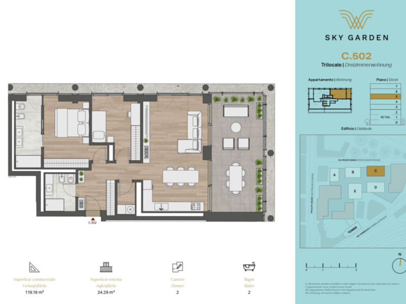 APPARTAMENTO C502 - Syk Garden C: Proponiamo in vendita nuovo, ampio trilocale con terrazza e vista parco al quinto piano - disposizione interna quanto segue: ingresso, soggiorno con cucina, 2 stanze da letto, 2 bagni (di cui uno finestrato) e terrazza.