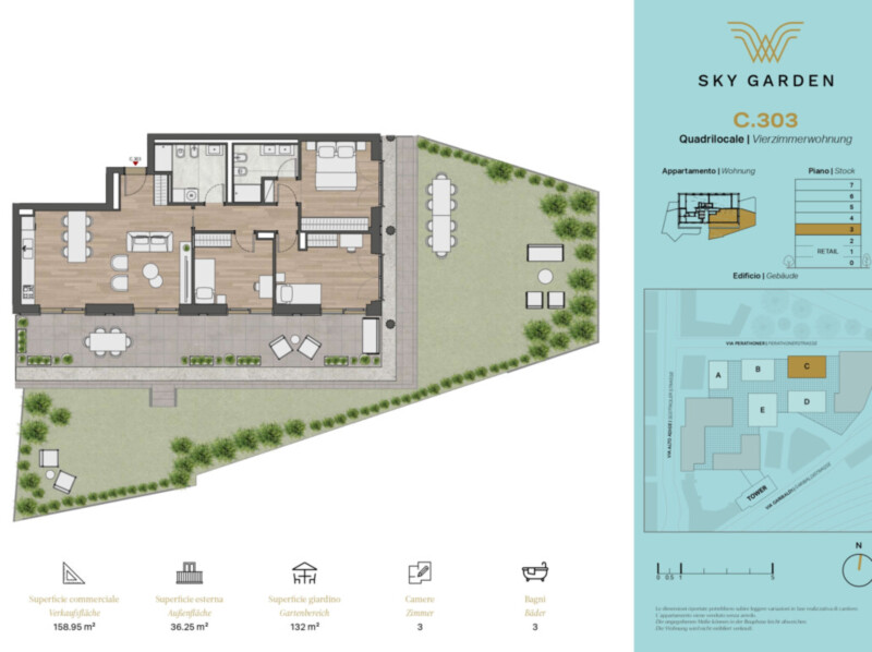 APPARTAMENTO C303 - Sykgarden C: Proponiamo in vendita nuovo quadrilocale con terrazza e ampio giardino al terzo piano - disposizione interna quanto segue: ingresso, soggiorno con cucina, 3 stanze da letto (di cui una con bagno padronale), bagno, WC, terrazza e giardino privato.