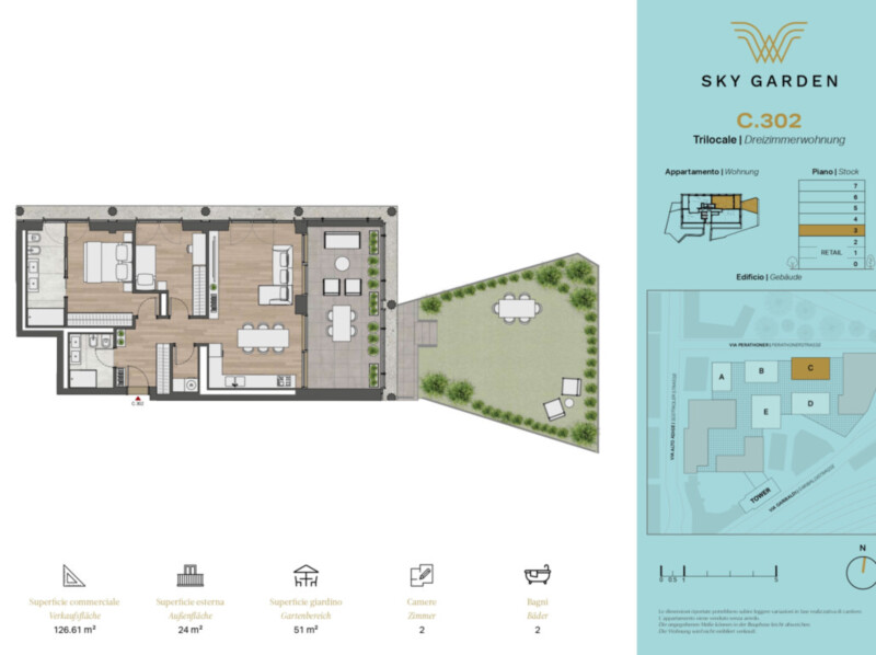 APPARTAMENTO C302 - Syk Garden C: Proponiamo in vendita nuovo, ampio trilocale con giardino privato al terzo piano - disposizione interna quanto segue: ingresso, soggiorno con cucina, 2 stanze da letto, 2 bagni (di cui uno finestrato), terrazza e giardino privato.