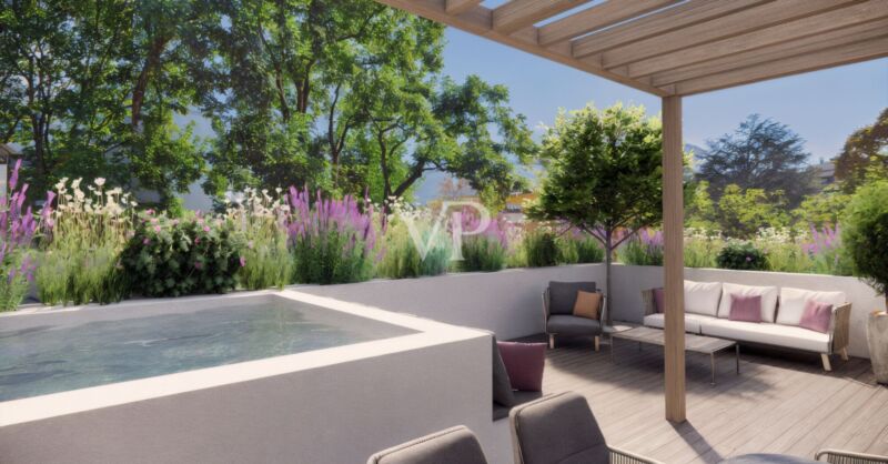 Una scala interna collega l’abitazione alla terrazza privata di 65 m², un vero attico panoramico con predisposizione per cucina esterna, piscina / vasca idromassaggio e zona lounge-giardino.