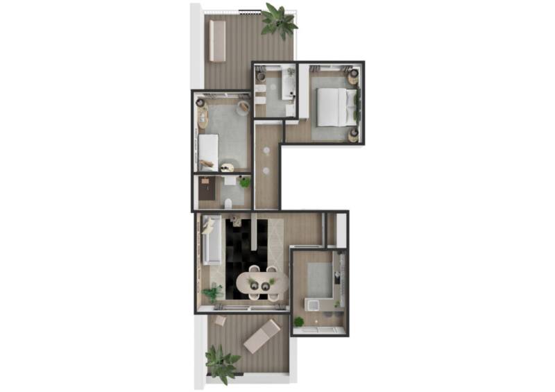 La zona notte è composta da due camere da letto, pensate per garantire comfort e privacy. Gli ambienti sono completati da doppi servizi, di cui uno finestrato, per una maggiore funzionalità e comfort. Unulteriore terrazza aggiunge uno spazio esterno supplementare, ideale per rilassarsi allaria aperta.