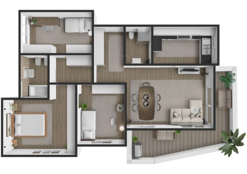 La zona notte è composta da tre camere da letto confortevoli, adatte a soddisfare le esigenze di una famiglia o di chi desidera ambienti flessibili. Sono presenti doppi servizi, uno dei quali finestrato, per offrire la massima praticità e comfort.