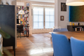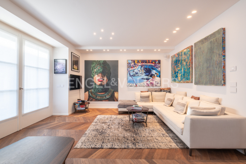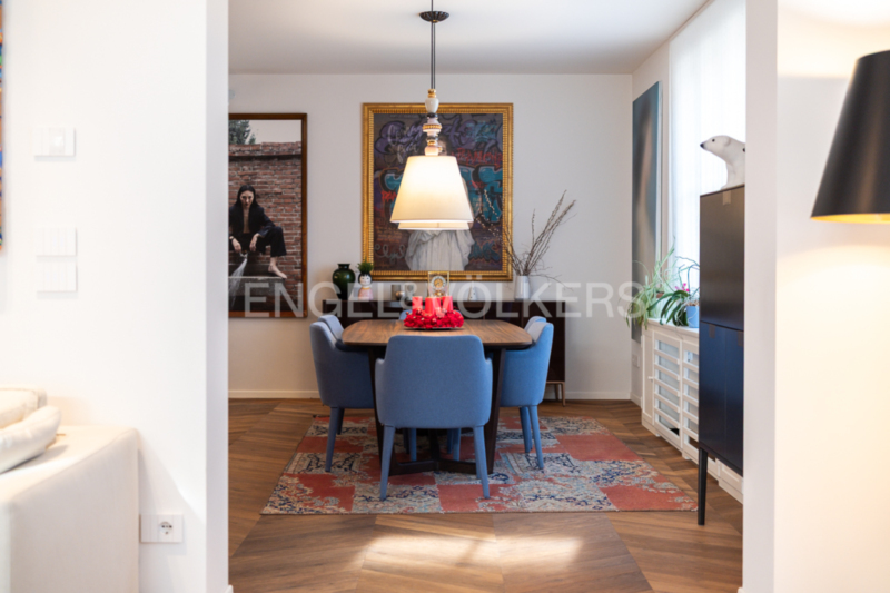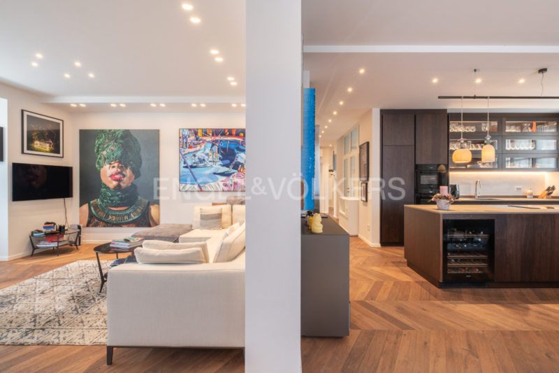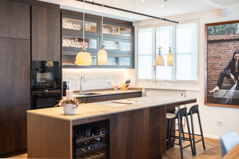 La zona giorno open space, composta da soggiorno e sala da pranzo, colpisce per la sua straordinaria ampiezza, ulteriormente valorizzata – come in tutto l’appartamento – da un’imponente altezza interna di tre metri. La cucina su misura, con moderna isola centrale, elettrodomestici da incasso Miele di alta qualità e cantinetta vini integrata, rappresenta il fulcro elegante della vita quotidiana. Il soggiorno, particolarmente luminoso grazie alle numerose finestre, offre accesso a un balcone. Tutti gli infissi sono stati smontati e restaurati con cura artigianale tradizionale nel corso della ristrutturazione, preservando così il carattere storico dell’edificio e integrandosi al contempo in modo armonioso con l’arredo moderno.