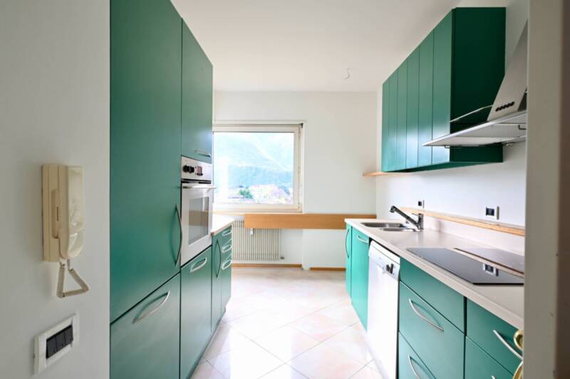 La zona giorno, luminosa e accogliente, si affaccia direttamente sullampia terrazza, creando una piacevole continuità tra gli spazi interni ed esterni. La cucina è separata e ben organizzata, con spazio sufficiente per le esigenze quotidiane. La vista sulle montagne circostanti dona allappartamento unatmosfera particolarmente gradevole.