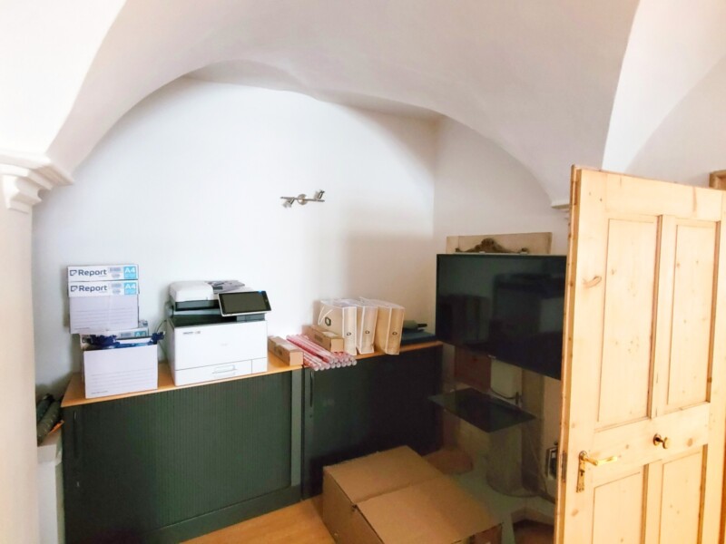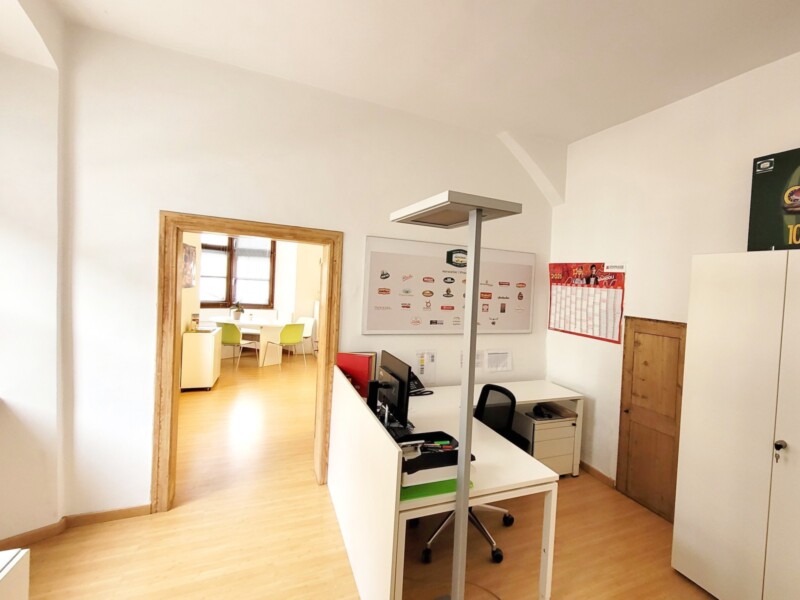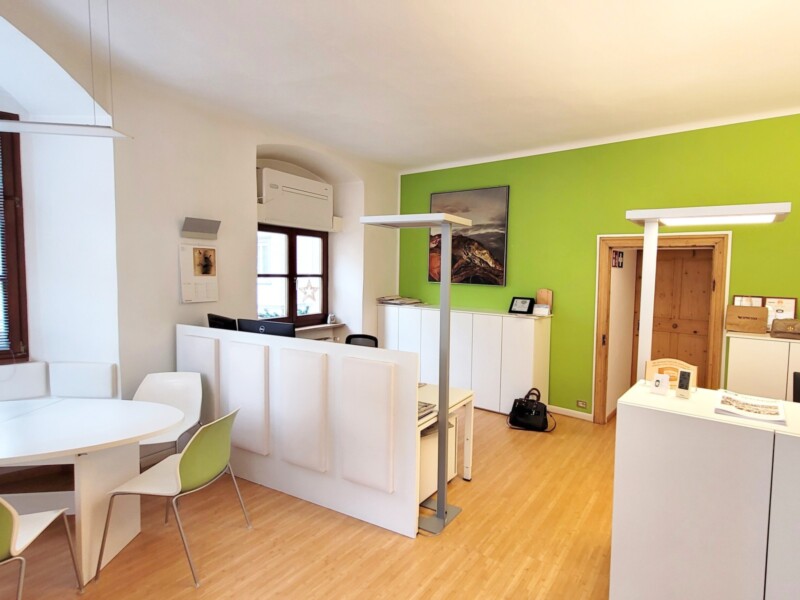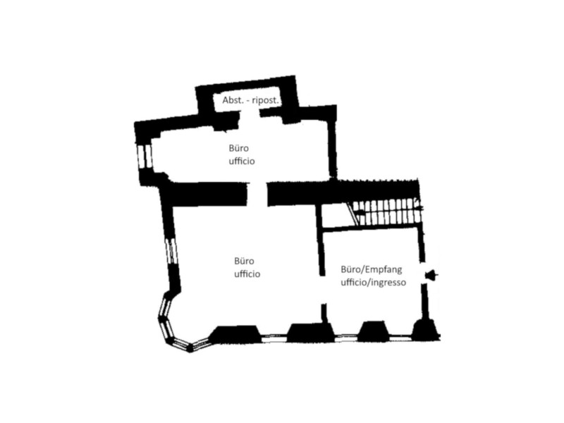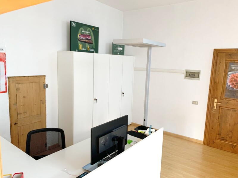 L’ufficio si trova nell’edificio d’angolo die Via Portici/Piazza Erbe, al primo piano (senza ascensore). L’unità ristrutturata comprende una zona reception, due uffici (con Erker!), un ripostiglio. Il WC si trova nel corridoio.