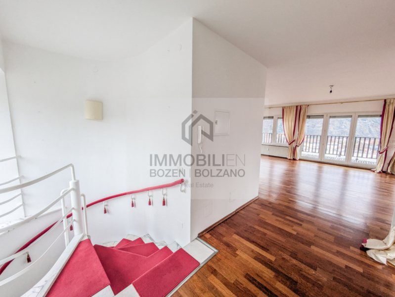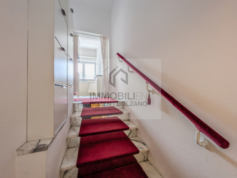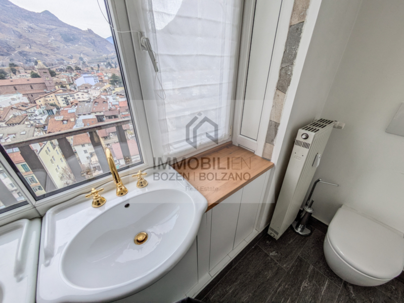 L’ufficio si trova nel centro storico di Bolzano, in un edificio al 10° piano. Si estende su due piani e ha una superficie di circa 94 mq. Dopo l’ingresso, una piccola scala conduce al livello inferiore (primo piano dell’unità), dove si trovano un piccolo ufficio o un archivio. Tramite una scala a chiocciola si accede al livello superiore. Qui si trovano un ampio ufficio open space con vista panoramica sui tetti di Bolzano, una grande terrazza e un piccolo bagno.