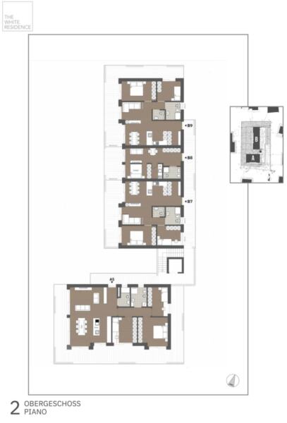 "The White Residence" è composto da due edifici e dispone di un garage sotterraneo con annessa cantina, posti auto e posti per biciclette elettriche al piano terra. Ogni appartamento avrà il proprio giardino privato, terrazza o loggia.