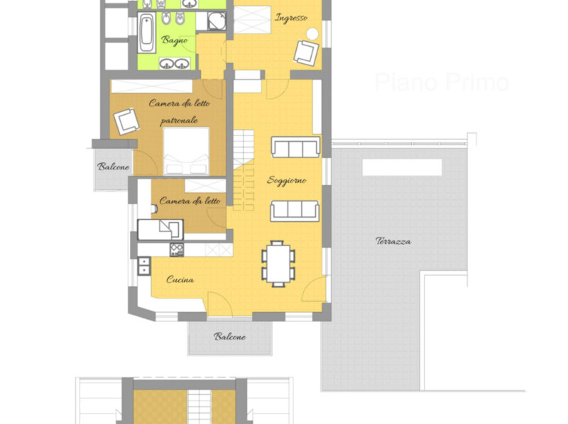 Piano Primo: 2 ampie camere da letto, 2 sale hobby con finestre, ampio soggiorno con cucina, 2 bagni, ingresso, balcone e terrazza.