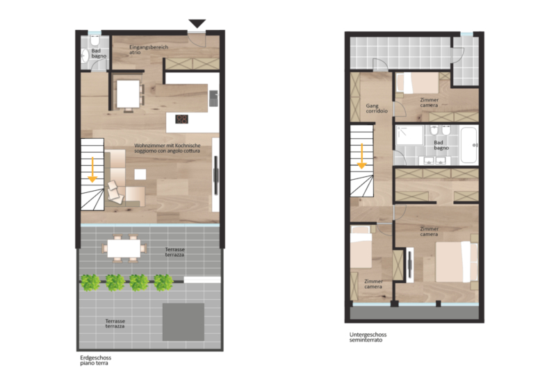 Al piano terra si trova una zona giorno molto luminosa e ampia, dotata di una moderna cucina a vista. C'è anche un'ampia zona d'ingresso e un WC diurno. Dal soggiorno si accede all'accogliente terrazza con zona barbecue e numerosi posti a sedere per godersi il sole.