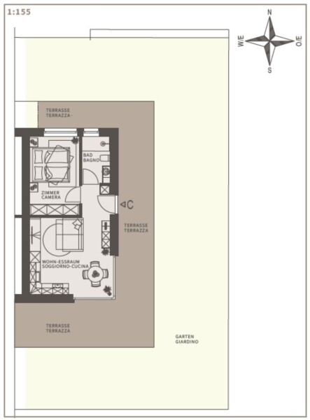 L'appartamento si trova al piano terra di un nuovo progetto edilizio ed è composto da un ingresso, un soggiorno con angolo cottura, una camera da letto e un'ampia terrazza con giardino. Un locale cantina offre ulteriore spazio di archiviazione. I garage possono essere acquistati con un costo aggiuntivo di 35.000 euro + IVA.