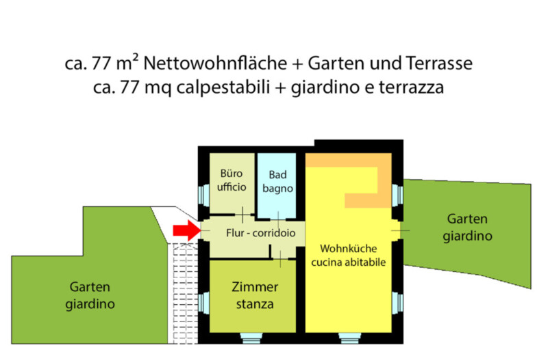 L'appartamento ha una superficie abitabile netta di circa 77 m² e offre una spaziosa camera da letto, una cucina abitabile luminosa e aperta, un bagno moderno e uno studio separato. Un vero punto di forza sono i due piccoli giardini privati e la terrazza, che creano ulteriore spazio abitativo all'aperto e invitano al relax. L'offerta è completata da una spaziosa cantina che offre ampio spazio di stoccaggio.