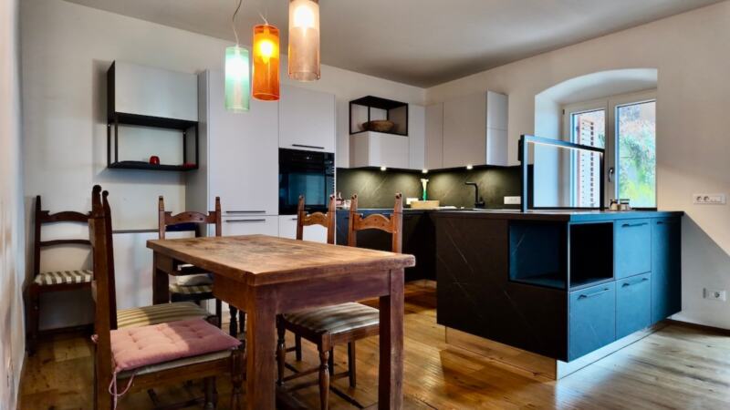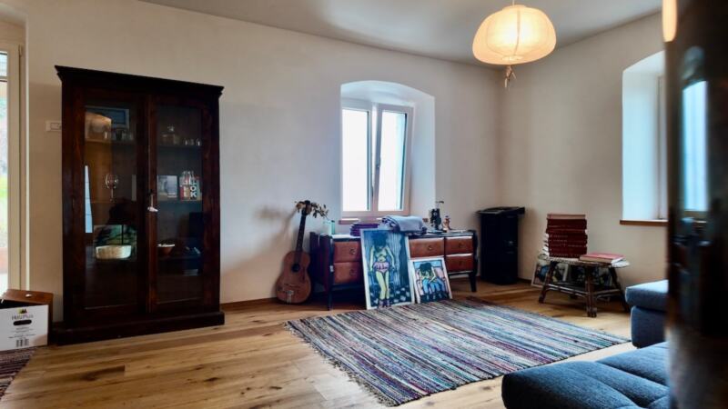 Nell'ambito della ristrutturazione, sono stati installati nuovi pavimenti ben isolati e il riscaldamento a pavimento è stato installato in tutto l'appartamento. Una stufa a legna crea un'atmosfera accogliente e sottolinea il carattere familiare dell'immobile.