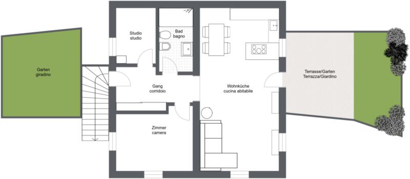 Un piccolo orto davanti alla casa e un secondo giardino con terrazza sul retro, che confina direttamente con il bosco.