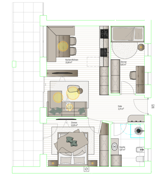 Questo appartamento al primo piano è composto da un ingresso, una zona giorno con angolo cottura, due camere da letto, un bagno con finestra e un bel balcone rivolto a ovest. Una cantina è inclusa nel prezzo; posti auto in garage sono acquistabili con un sovrapprezzo.