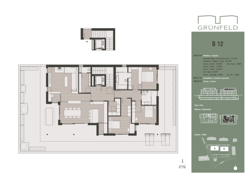 Con una superficie abitabile generosa, questo attico offre comfort e spazio eccezionali. L’ampia zona giorno e pranzo, luminosa e ariosa, regala una vista aperta sulla natura. Un elegante camino con stufa crea un’atmosfera accogliente e raffinata. Le grandi vetrate a tutta altezza collegano gli interni alla terrazza panoramica di 187 m², portando la bellezza delle montagne in ogni stanza. Tre ampie camere da letto, di cui una con bagno privato, garantiscono relax e tranquillità. Completano la proprietà tre bagni in totale e una pratica lavanderia. L’ascensore condominiale conduce direttamente all’ingresso dell’appartamento, che offre ampi spazi di deposito.