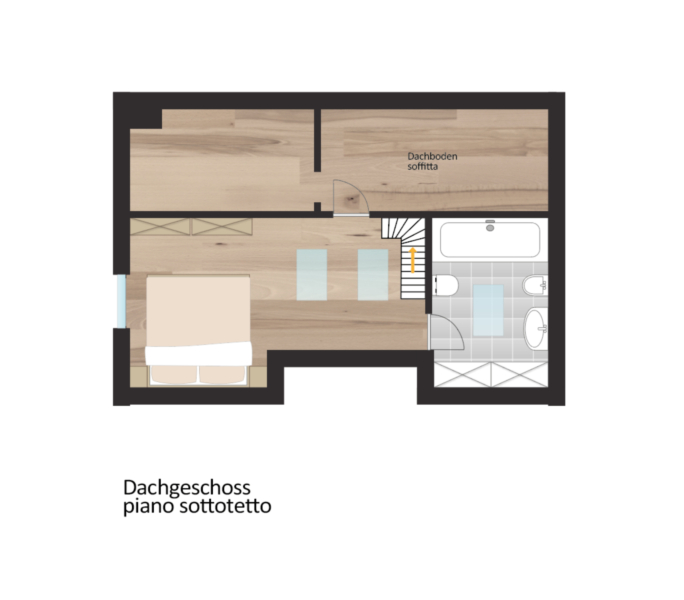 Al primo piano si trovano un accogliente ingresso, un bagno luminoso e un’ampia cucina-soggiorno con zona notte separabile. Al piano superiore si trovano una camera da letto aggiuntiva, un secondo bagno moderno e una soffitta spaziosa. Completano la proprietà una cantina e un garage, che offrono ulteriore comfort.