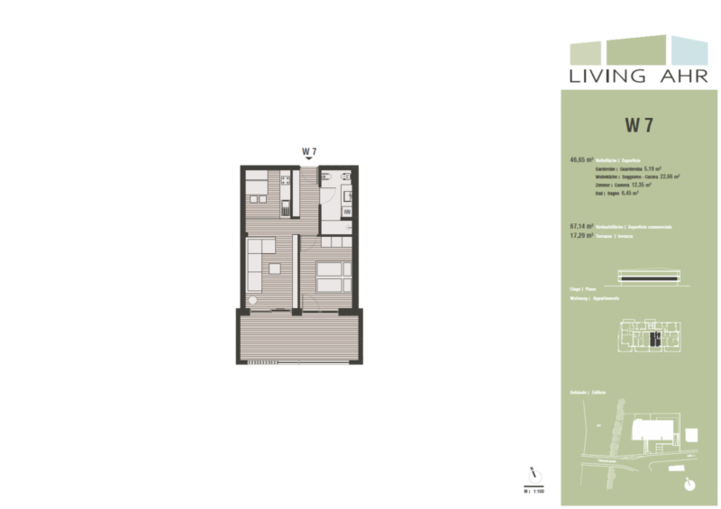Questo bilocale al 1° piano offre un comfort abitativo moderno e molto spazio. È composto da un'invitante zona d'ingresso, un'accogliente camera da letto, un bagno di alta qualità e un'ampia zona giorno/pranzo. La terrazza invita al relax. L'appartamento dispone anche di una cantina al 1° piano interrato. Un garage doppio con porta elettrica può essere acquistato con un supplemento.
