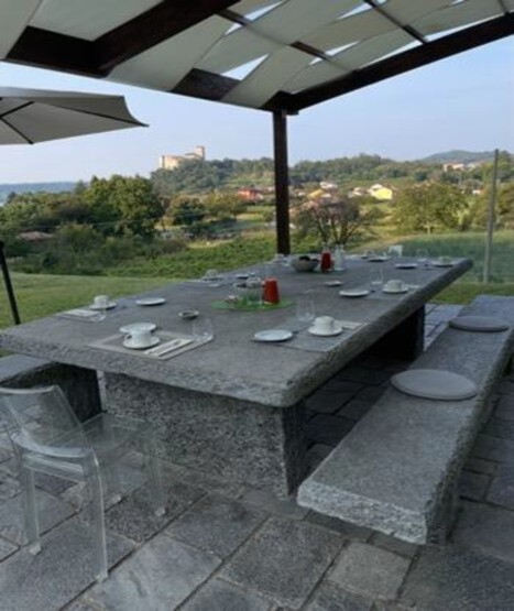 • Terrazza con maestoso tavolo in pietra (3,5 x 1,8 m), un unico imponente piano che costituisce il cuore della casa e il luogo ideale per incontri conviviali.