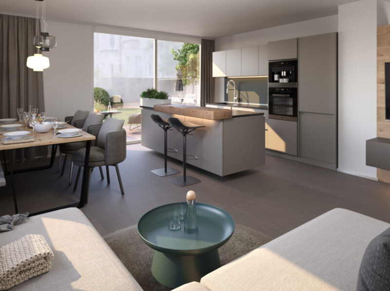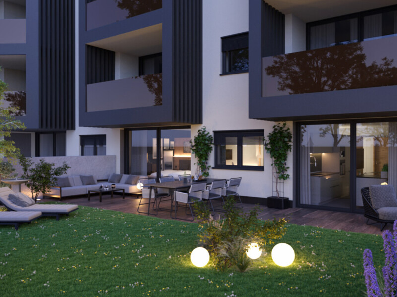 In questo moderno e raffinato complesso residenziale è in vendita un ampio quadrilocale con terrazza e giardino privato, che vanta una superficie netta di quasi 120 m².