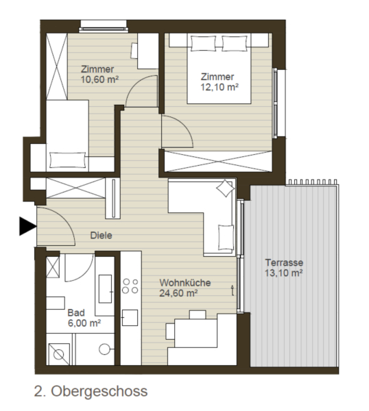 La zona giorno, progettata in modo aperto, offre accesso diretto alla terrazza, creando un ambiente luminoso e accogliente. L’unità dispone di due camere da letto e di un bagno moderno, integrato in modo pratico nel layout complessivo.
