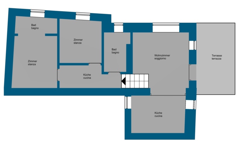 Il soggiorno colpisce per il suo design moderno e luminoso, mentre la cucina è separata da due eleganti gradini, un dettaglio architettonico che conferisce agli spazi una dinamica e una profondità particolari.
