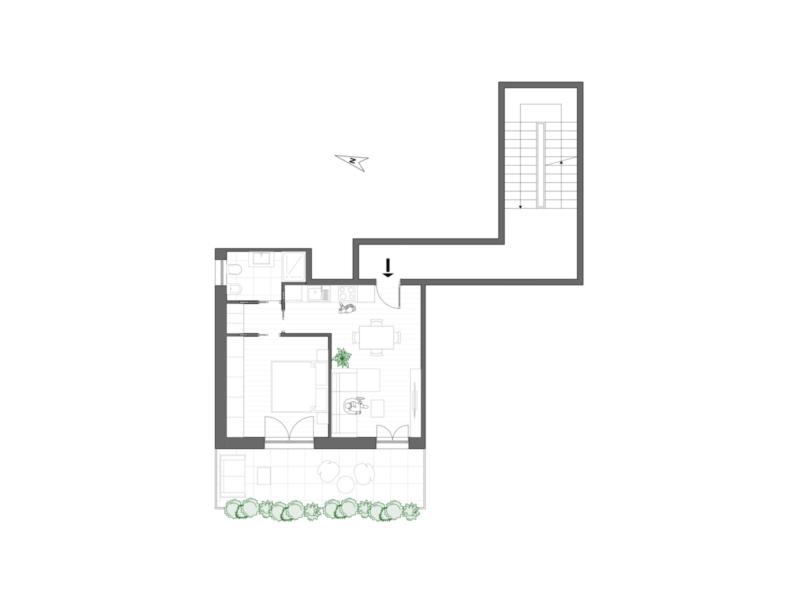 L’immobile accoglie con un ingresso che conduce a un luminoso soggiorno con angolo cottura, uno spazio funzionale e piacevole, perfetto per momenti di convivialità. La zona notte è composta da una spaziosa camera matrimoniale e da un bagno finestrato, garanzia di comfort e praticità.