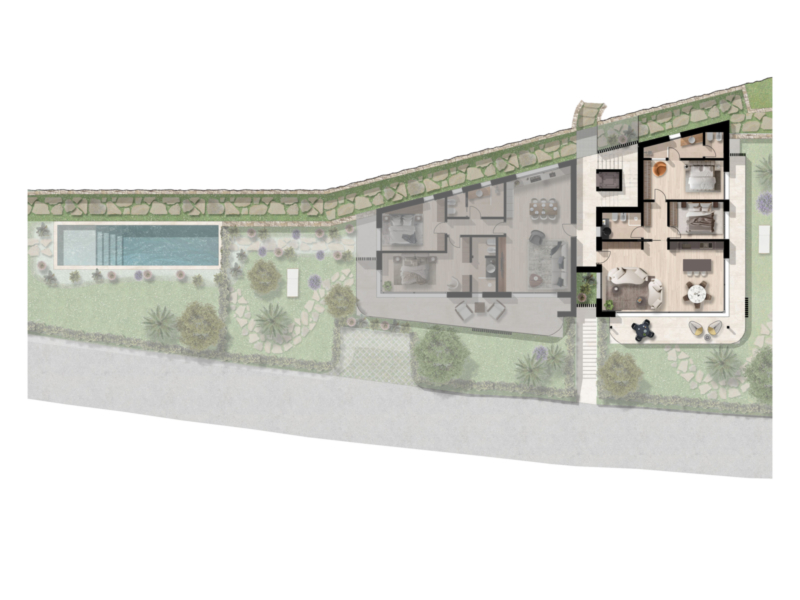 Ogni unità è dotata di una terrazza privata e/o di un ampio giardino, ideale per momenti di relax all'aperto. Il soggiorno con cucina a vista è ampio e armonizza alla perfezione gli spazi interni ed esterni.